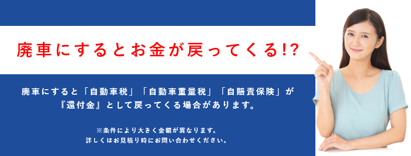 動かせなくなった事故車・水没車などの不動車でも、原則無料でお引き取りにお伺いいたしますのでご安心ください。また、自分でやると面倒な廃車手続きも無料で代行!お客さまのお手間は最小限でラクラク廃車完了です。
